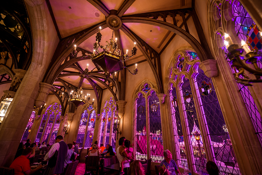 The grand staircase is to be “ascended” one red-carpeted step at a time, and certainly not in a hurry. How many times in one’s life do you get to climb a spiral majestic staircase case and peak out of beautiful stained glass windows? (There is also a gilded elevator available to transport you as well.) Before you head into the Banquet Hall though, stop and peek at the view of the Grand Hall below and look at the amazing view. It’s breathtaking. Now that you are ready to enter the dining area, stop and look around. From stone Gothic archways, leaded glass windows, banners with coats of arms and views overlooking Fantasyland- every detail is meticulous.